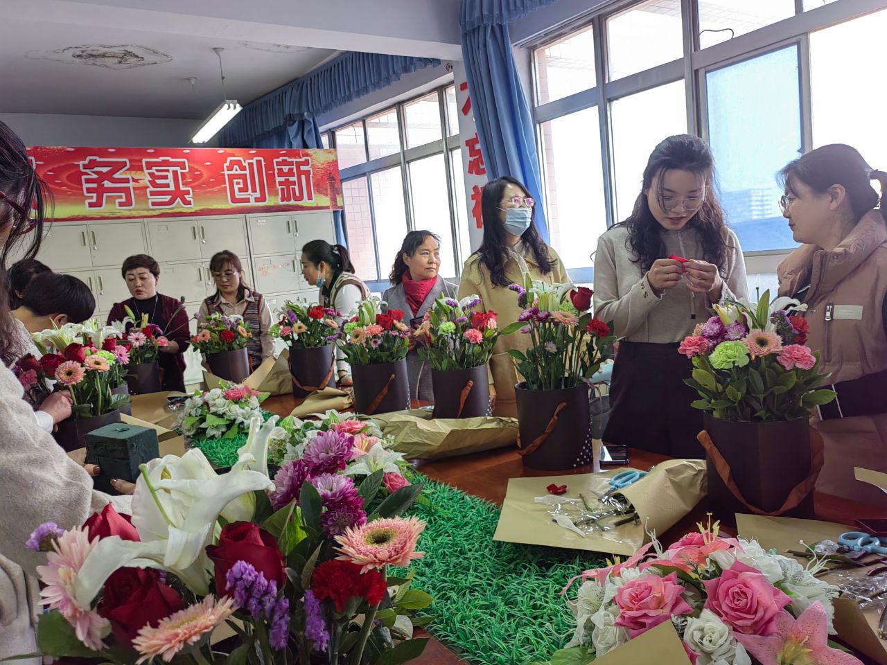 在插花老师的指导下,女老师们学习到了插花艺术的基本知识,对每朵花象征的意义、花的组合传达的意味、花的层次展现的意韵有了进一步的了解,女老师们根据自己的理解和对美的感受插出了既遵循插花艺术基本原则,又各具个人特色的属于自己的插花作品,并纷纷用手机来定格这美的时刻。