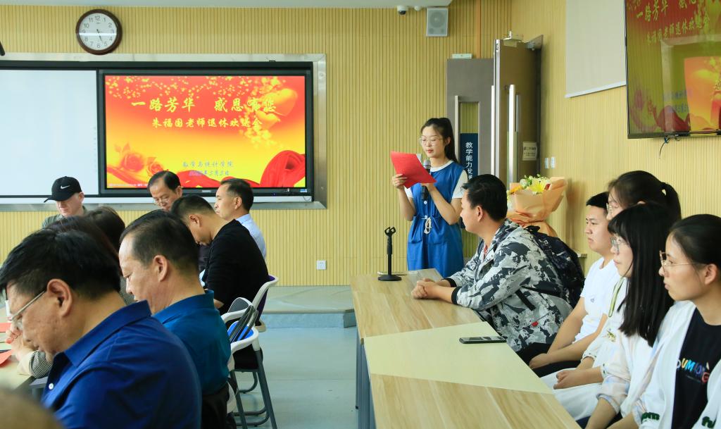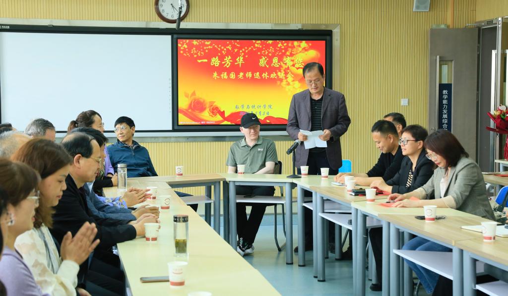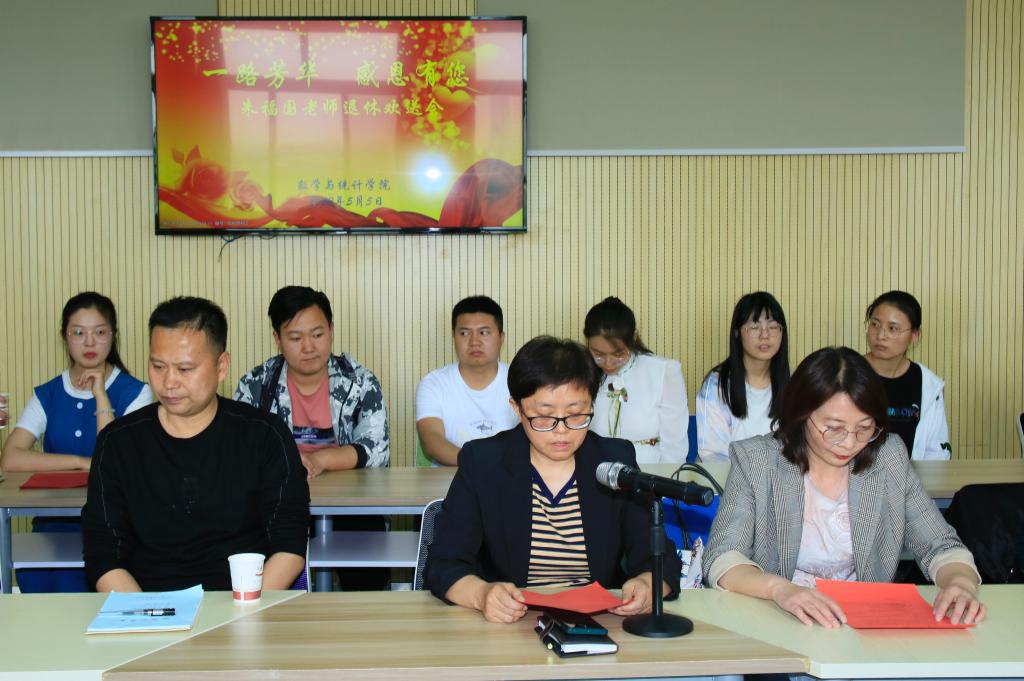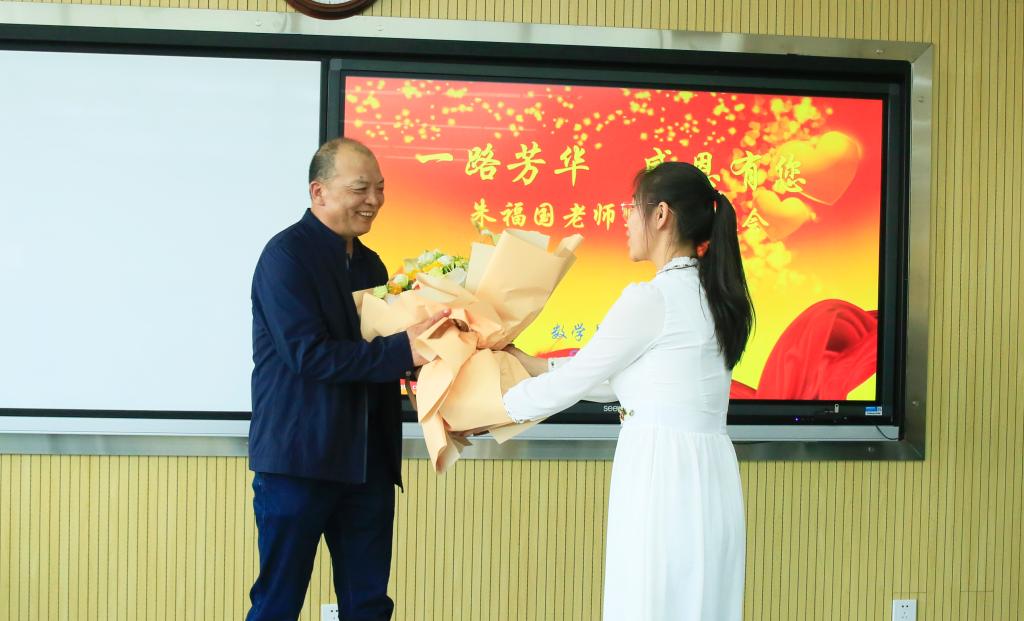 5月5日,williamhill中文官网在教发中心905为即将退休的朱福国教授举办“一路芳华感恩有您”退休欢送会。欢送会由公司经理郭育红教授主持,董事长张汉燚教授,公司联系领导、党委常委、教务处处长赵柱教授出席,公司全体教职工、数学与应用数学专业2019级1班全体员工和部分员工代表参加了欢送会。
