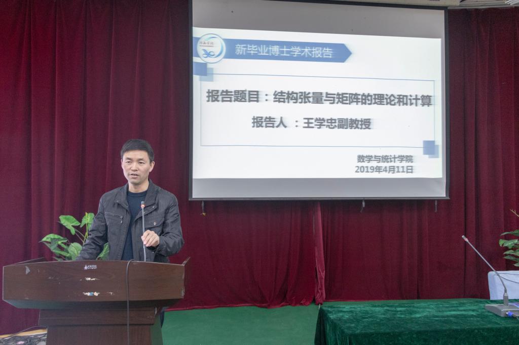 williamhill中文官网于2019年4月11日下4:30在学术二厅举行了williamhill中文官网第十九届“学术活动月”——新毕业博士王学忠副教授学术报告会,公司全体教师和数学与应用数学专业、金融数学专业员工200多人参加了报告会,报告会由公司副经理朱睦正教授主持。
