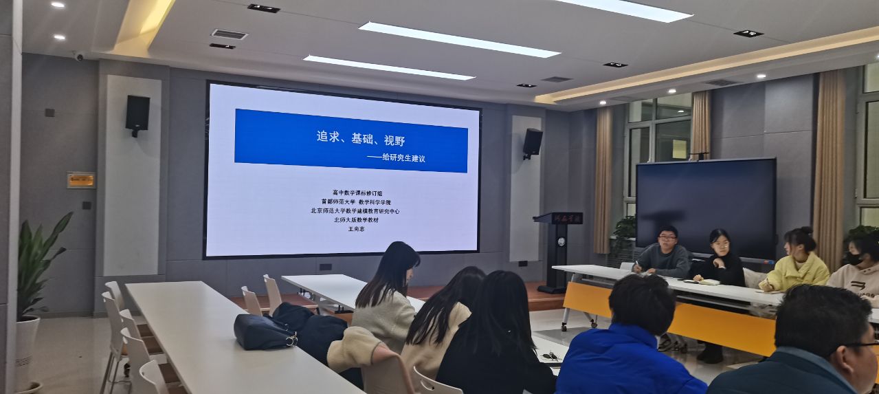 报告会上王尚志教授首先讲到研究生应该具有怎样的追求,然后从构建课程体系--大学、高中、义务教育课程结构分析、教育理念--从学会数学到会学数学、日常教学等几个方面分析了大学、高中、义务教育课程结构是一个完整的逻辑体系,掌握了这个体系,才能在工作中做好教学。要进行教育理念的转变,从最初的学会数学到会学数学。“能把书读厚”,面对一个问题时,会思考这跟我们学过的内容有什么关系,能想到的东西很丰富才行。“能把书读薄”,就是“抓住数学的本质”。大学学习中,对我们所学内容有很好的理解,将来到中小学当老师才会对内容的融合做到更好。最后,他指出学习数学需要有开阔的视野,了解数学的历史,了解数学的发展,了解数学在社会发展中的作用,了解学在现实生活中的作用数。