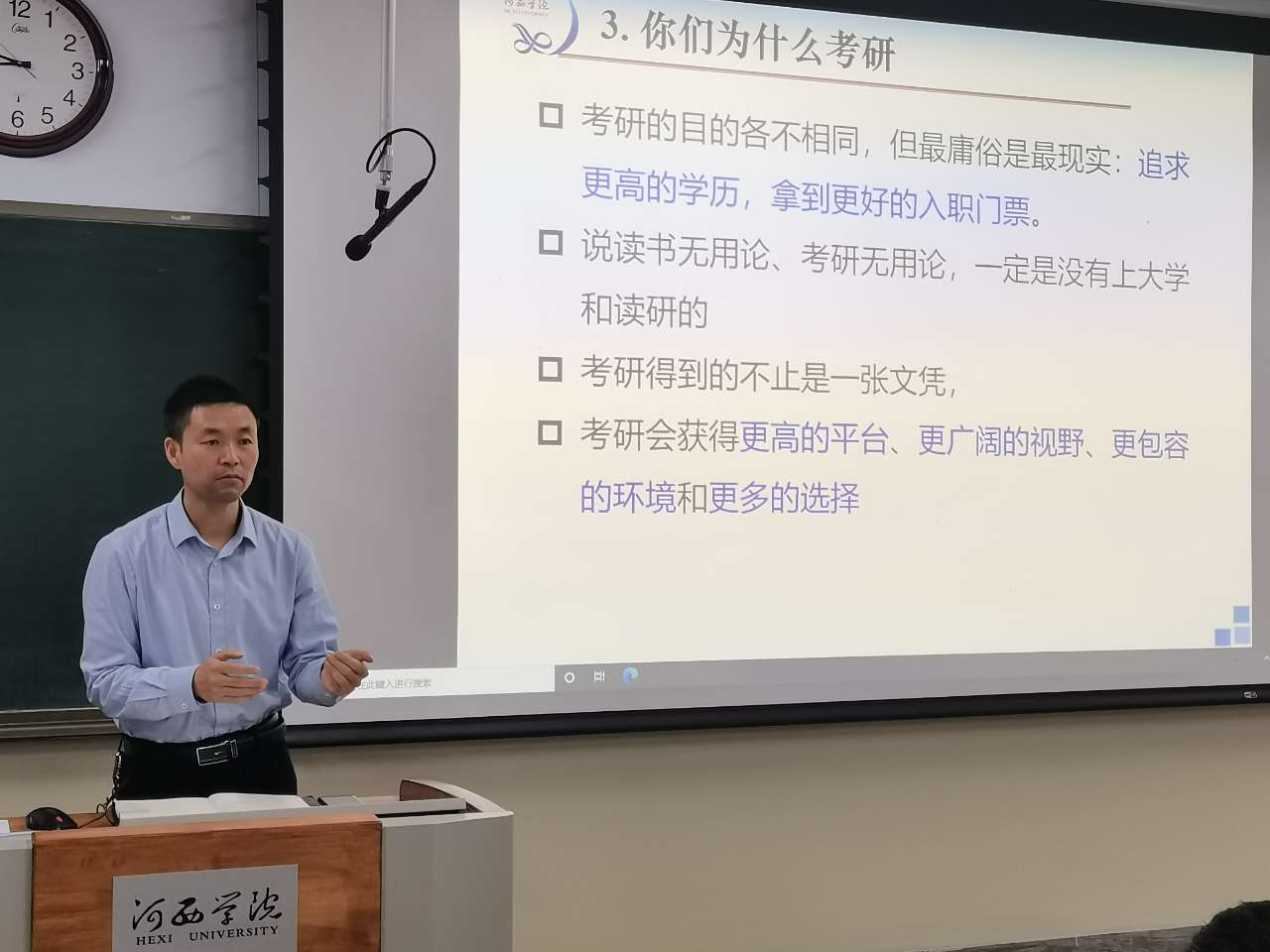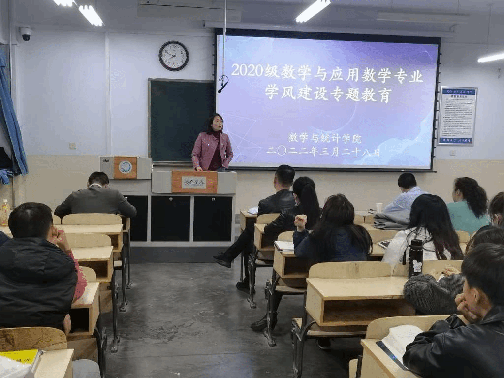 为营造互学互鉴、教学相长、积极向上的学业学术氛围,推动公司学风建设在“经常”和“长效”上下功夫,3月28日晚7:30,2020级数学与应用数学专业学风建设专题教育在三教A301教室如期举行。公司副经理王学忠教授作了题为“大学应该怎样度过”的报告,公司副经理朱睦正教授作了题为“我们考研为什么”的报告。公司经理郭育红教授,辅导员老师,数学201班、数学202班班主任老师及2020级数学与应用数学专业的88名员工参加此次专题教育。