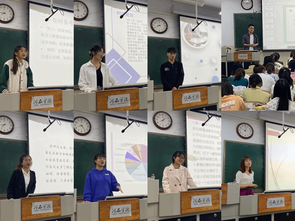 会上,王学珍、胡亚男、程瑞英、刘高举、王婧、周朋飞、吕新梅、常元元等八名同学分别结合自身的经历,从不同维度就考研期间该如何合理地安排复习时间、考研英语的复习方法、院校选择、心态调整等问题作了详细介绍。此外,还讲述了参加考研复试的经验与注意事项。同时,周永辉以“学习改变命运,考研改变人生”为题作了交流发言。